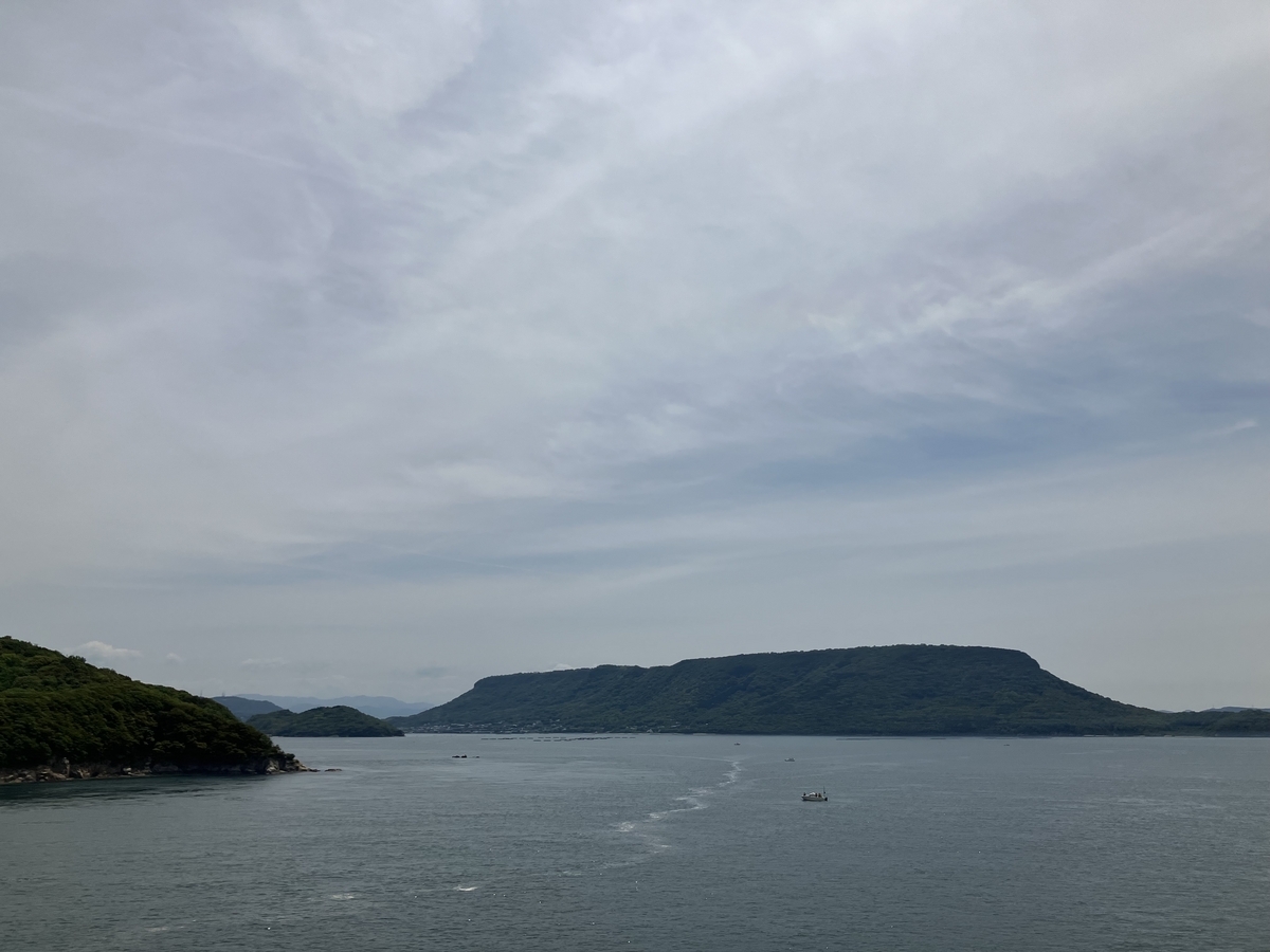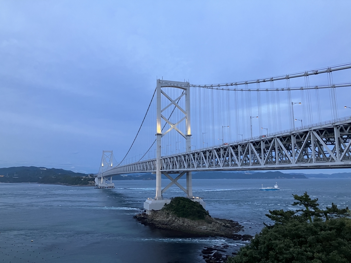 渦潮は見た感じ無いようだったが、流れがめちゃくちゃ速いことだけは分かった。この時間帯は太平洋側から播磨灘へと流れる時間だったらしく、流れに逆らう向きに進もうとしている船が全然前に進んでなくて笑った。この流れの速さはどうやら干潮と満潮によるものらしく、渦潮が発生する要因となるそうだ(渦潮が発生しやすい時間帯は満潮・干潮らしいので事前に調べていくのがよい。仕組みは下記のサイトがわかりやすい)